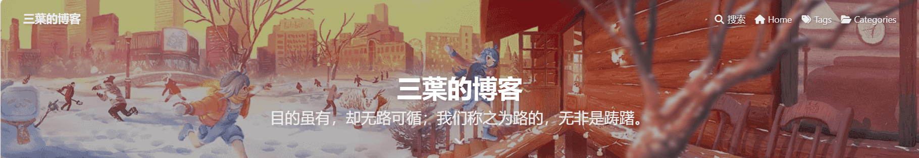 之后我们点击’分类’,就可以成功跳转到分类页面,但是,我们可以观察到,分类页没有顶部图片,是纯蓝色,不够美观,其实我们只要在source/categories/index.md的Front-matter部分添加一个top_img属性,指定顶部图片的路径即可。