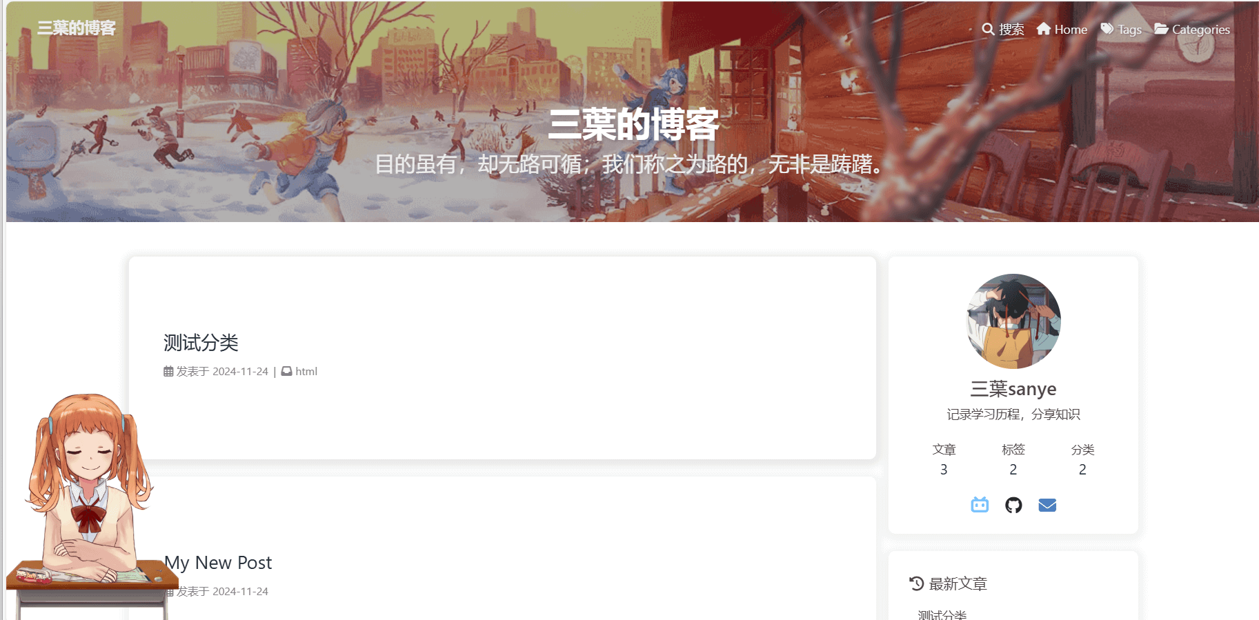 hexo+butterfly框架能帮助我们迅速开发一个美观实用的博客,这些框架,主题,以及相关插件的诞生,基于开发者雄厚的html,css,js等前端知识积累;做为刚入们的前端开发者,我也知道给光看文档能学到的实在是有限,在网上找资料学到的也是偏向实践,想要深入了解原理,自己做出这些效果,还得多学多练,打好自己前端基础。