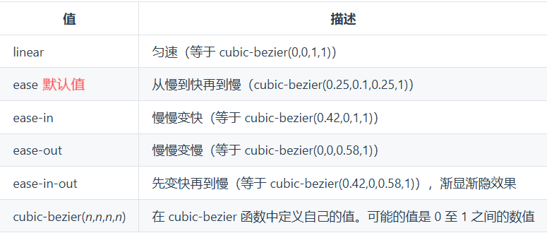 | animation-timing-function | 指定动画计时函数,即动画的速度曲线,默认是 “ease” | linear、ease、ease-in、ease-out、ease-in-out |