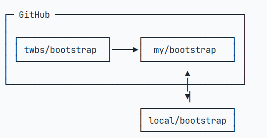 Bootstrap的官方仓库twbs/bootstrap、你在GitHub上克隆的仓库my/bootstrap,以及你自己克隆到本地电脑的仓库,他们的关系就像下图显示的那样: