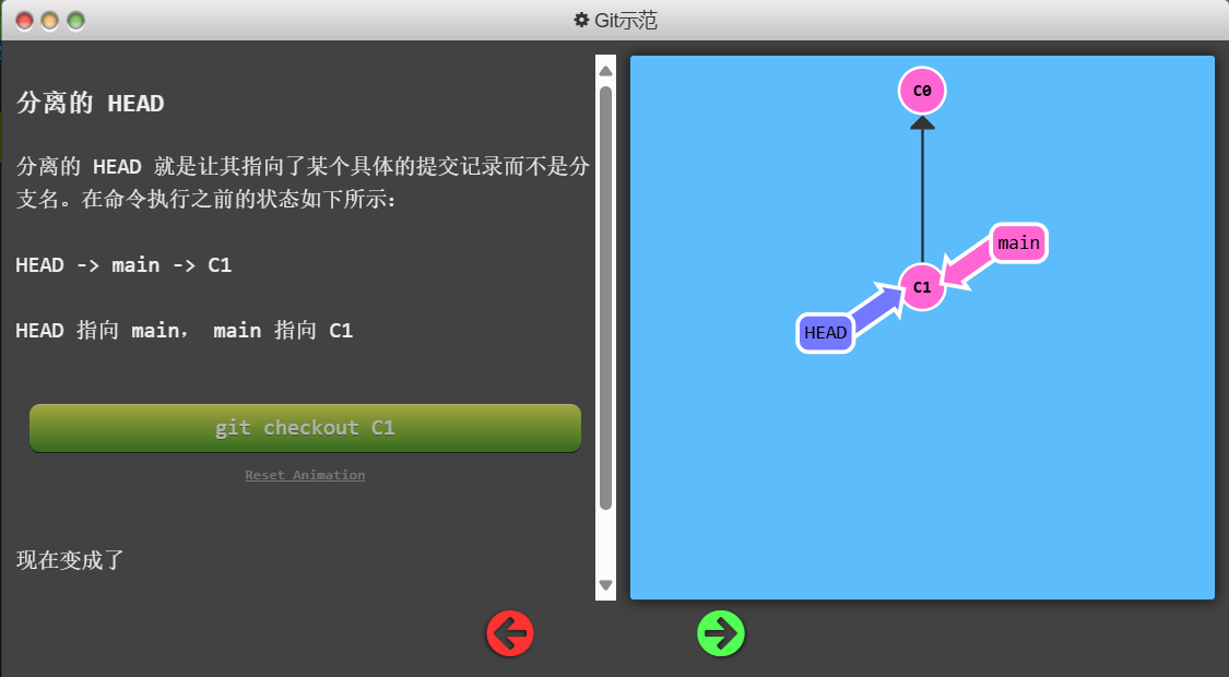 除了切换分支,git checkout指令还能让head指针指向具体的提交,而不是分支。只需要执行git checkout 提交的哈希值(输入前几位也行)即可