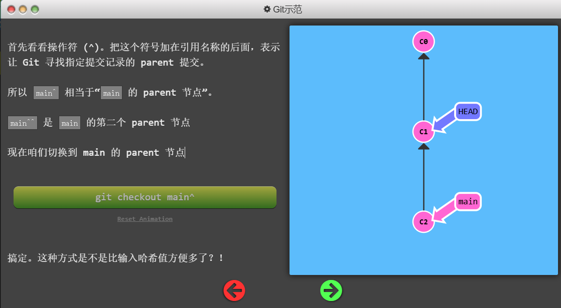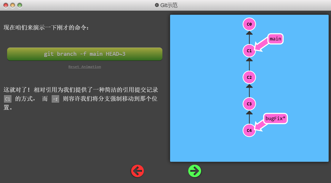 ~<num>向上移动多个提交记录,如~3通过下面这个指令强制移动分支指针main到c4的第三级父节点。