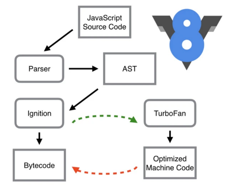 - 图片中的红色虚线是逆向的,这个过程叫做Deoptimization(去优化)。因为Ignition 收集的信息可能是错误的,比如 add 函数的参数之前是整数,后来又变成了字符串,V8 可以“撤销”优化版本的代码,回退到原始的字节码执行状态。