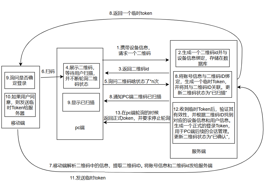 账号信息与二维码id绑定,并返回一个临时token;此时移动端会提示是否登录,pc端二维码状态变为已扫描移动端确认登录,会将