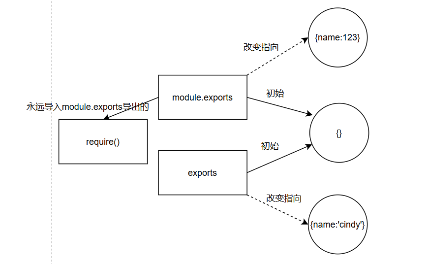 module.exports对象,将模块内的成员共享出去,默认为{}module.exports可以直接写成exports,它们起初指向同一个空对象