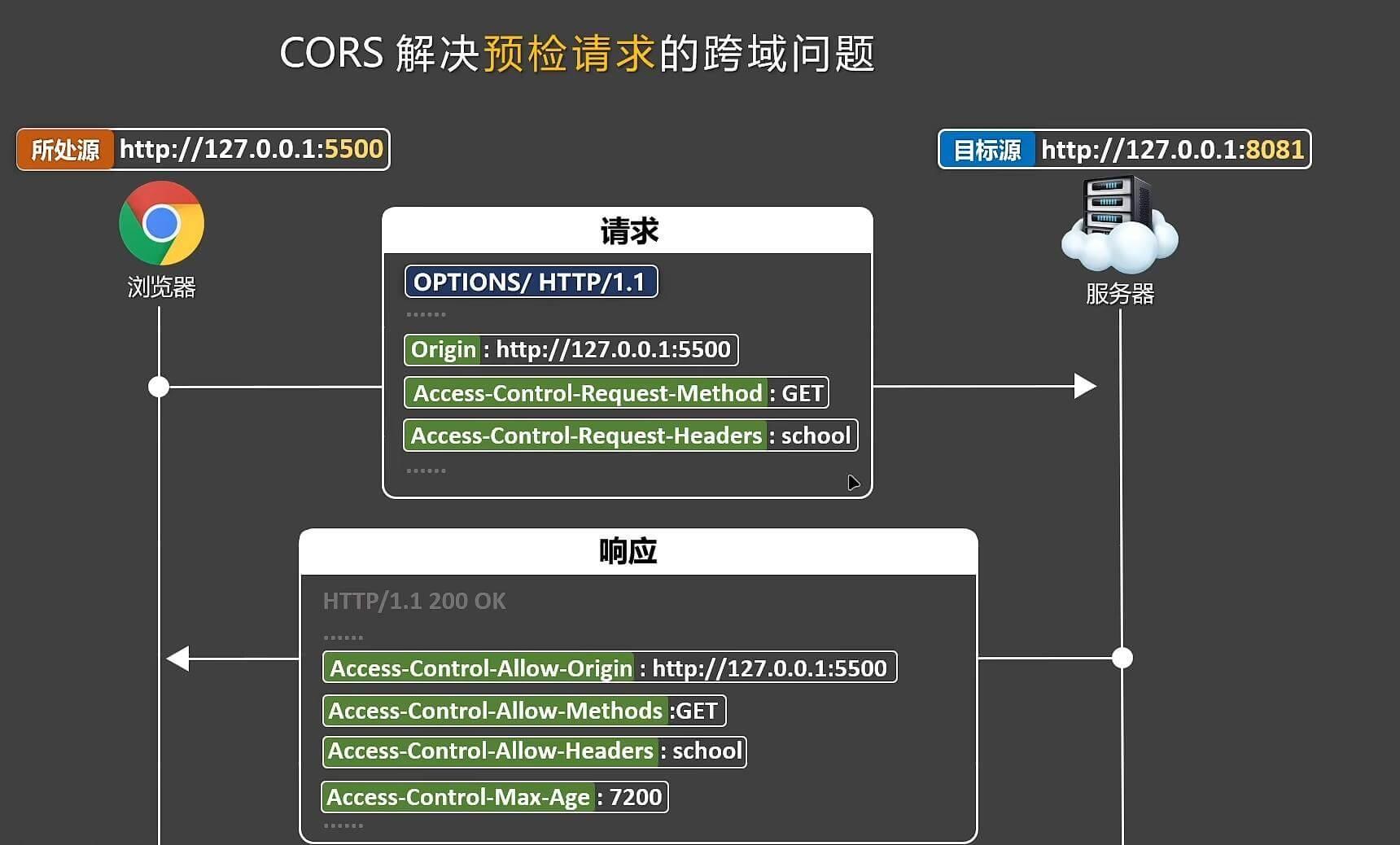 在请求头中携带Origin,Access-Control-Request-Method,Access-Control-Request-Headers字段,询问服务器是否接受来自xxx源,请求方法为xxx,请求头为xxx的跨域复杂请求,如果接受,才发送这样的复杂请求。