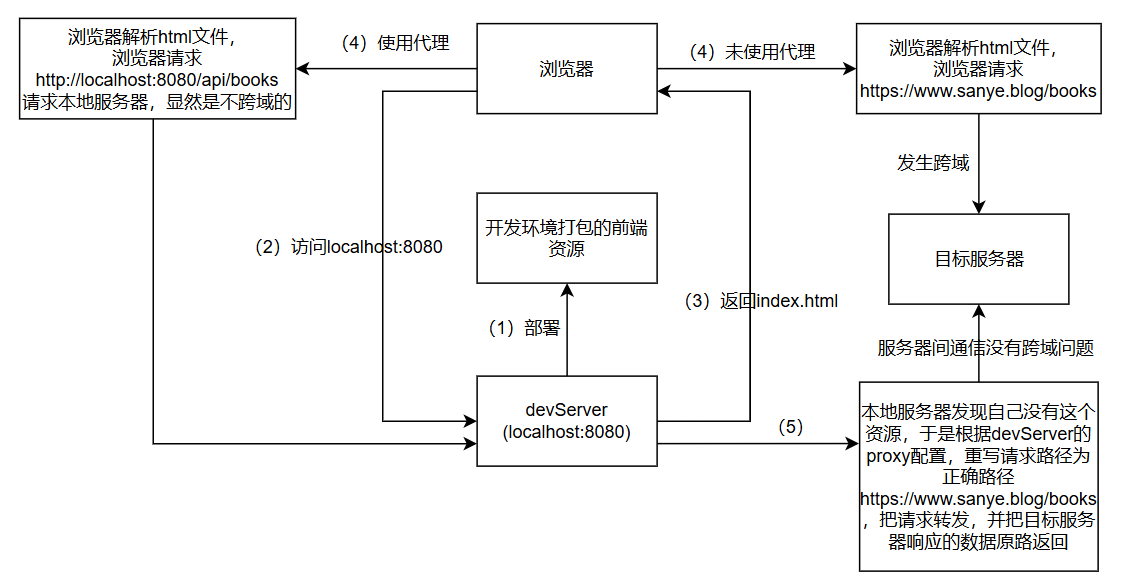 通过该服务器转发请求至目标服务器,本地代理服务器得到结果再转发给前端,因为服务器之间通信不存在跨域问题,所以能解决跨域问题。